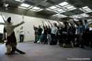 | 照明を落とした会場で、音楽に合わせて踊りまくるぜ! | 最初は参加者も少なかったですが、中盤には大勢の参加者が! | 曲に合わせてライトの色も変わり、会場のムードも盛り上がります! |